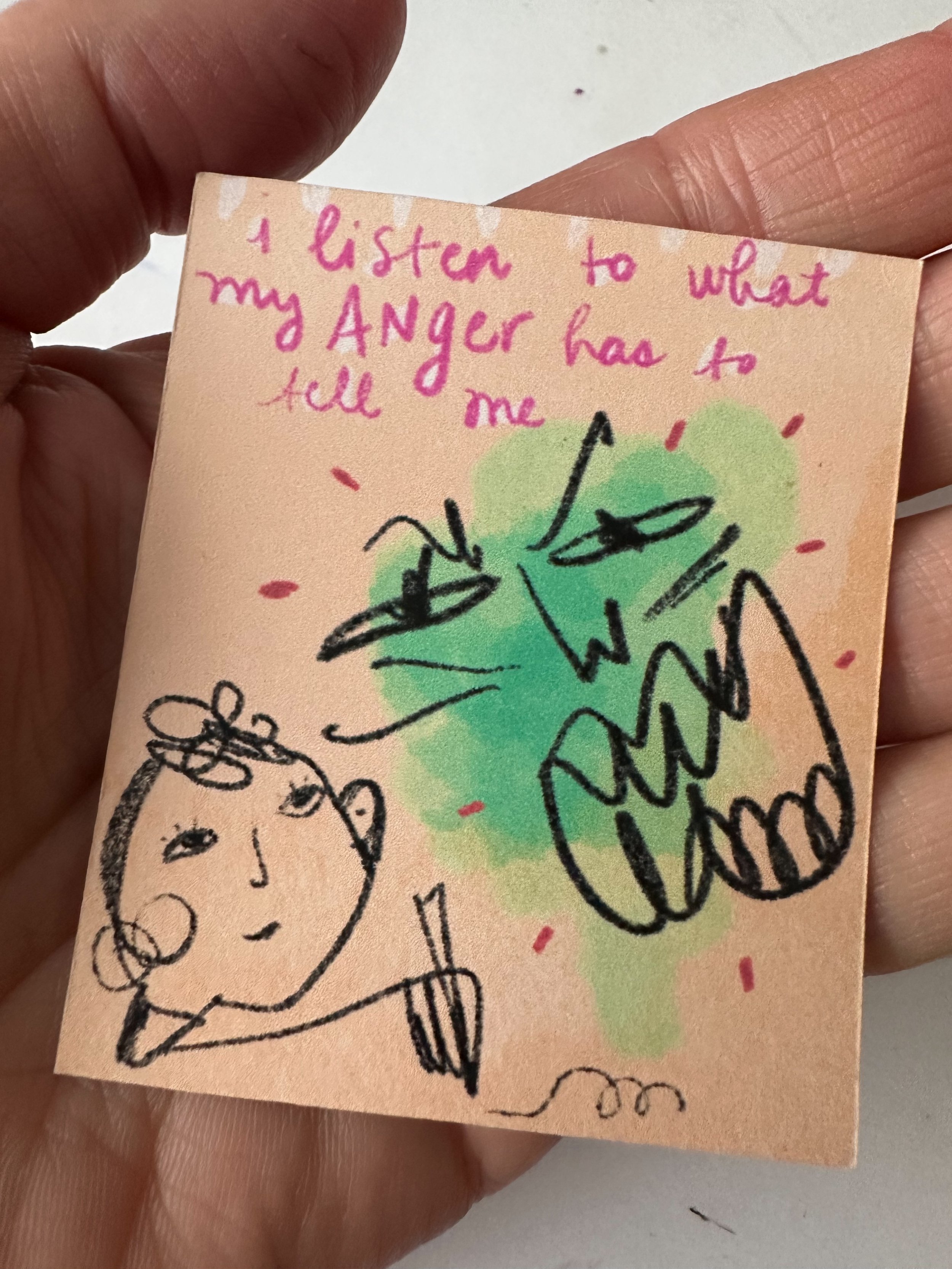 I made an affirmation card about listening to my anger. Sometimes it helps to have this picture in my head, as a step to being more compassionate towards myself.