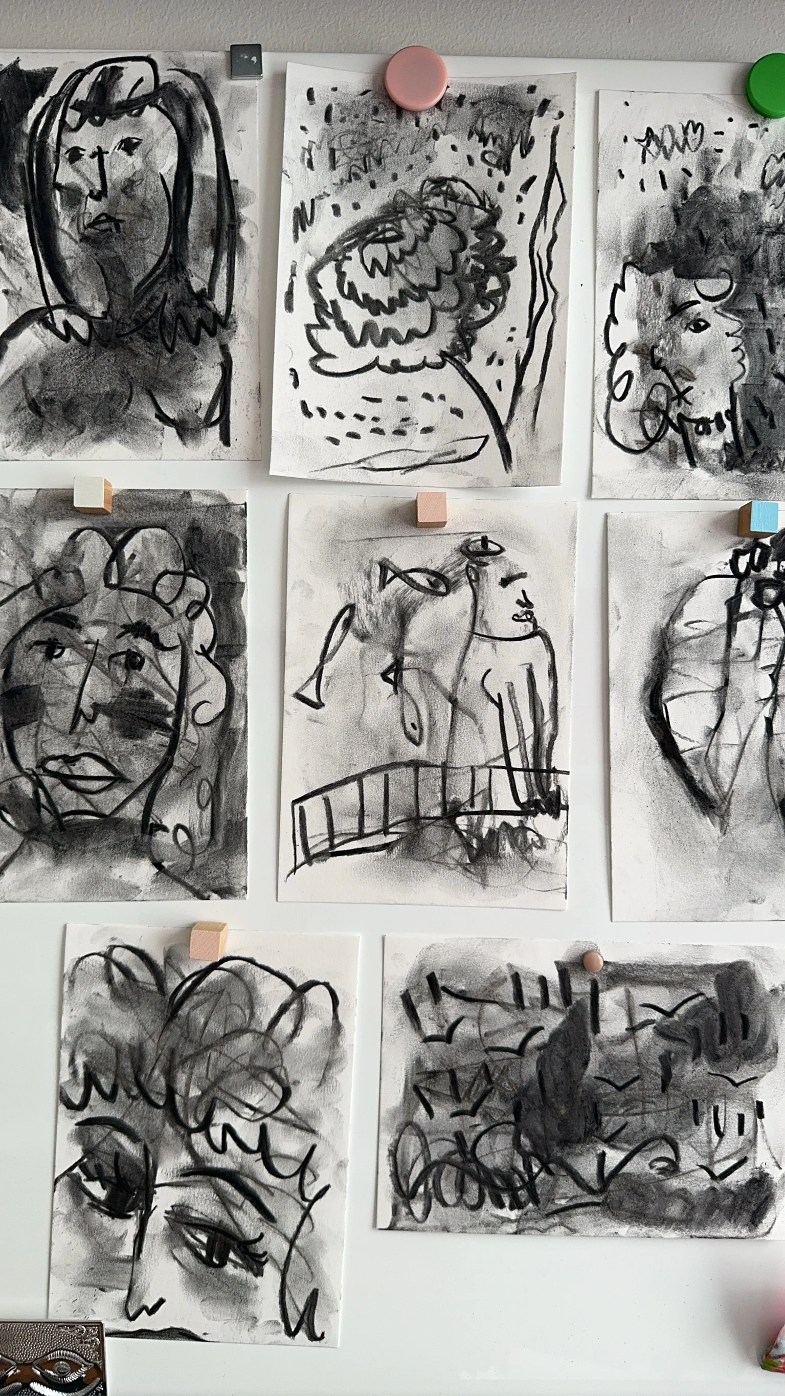 Charcoal is a wonderful medium. You can break it and smear it, and rub it out when you get frustrated with the results. This just adds more texture, and helps you to relax as you smudge and scratch and get everything dirty. What a joy!